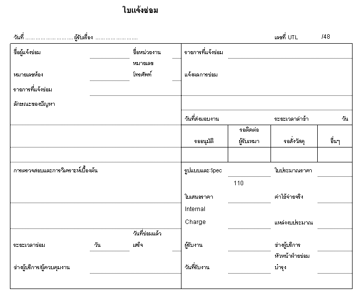- รอกข้อมูลในเอกสารแบบฟอร์มใบรับแจ้ง ซึ่งจะเก็บไว้ในตู้รับแจ้งของฝ่ายซ่อมบำรุงบริเวณด้านหน้าลิฟท์โดยสารชั้น 1 อาคาร EXC หรือ Download แบบฟอร์มได้ที่ Public Folders/Utility