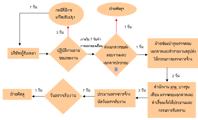 - สำนักงาน มจธ. บางขุนเทียนจัดส่งให้ฝ่ายซ่อมบำรุง ตรวจสอบเอกสารภายใน 1 วัน